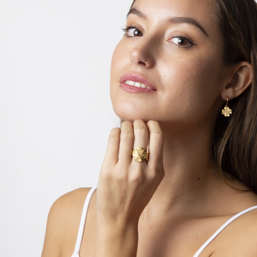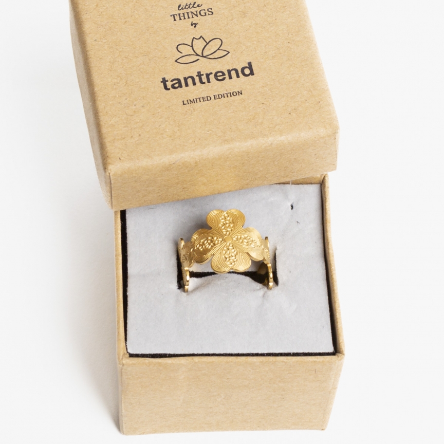 Anel ajustável em formato de trevo, com tamanhos variados. Feito em aço inoxidável com banho de ouro 14K. Cor única: dourado. Embalagem única. Medidas: ajustáveis. Composição: aço inoxidável.