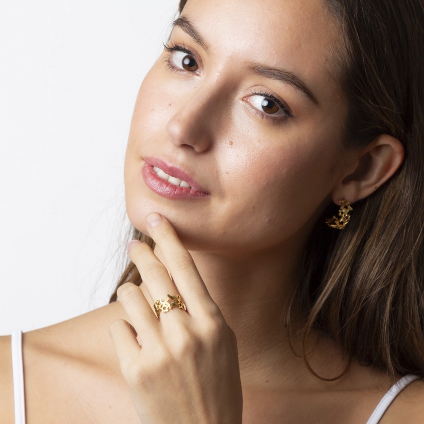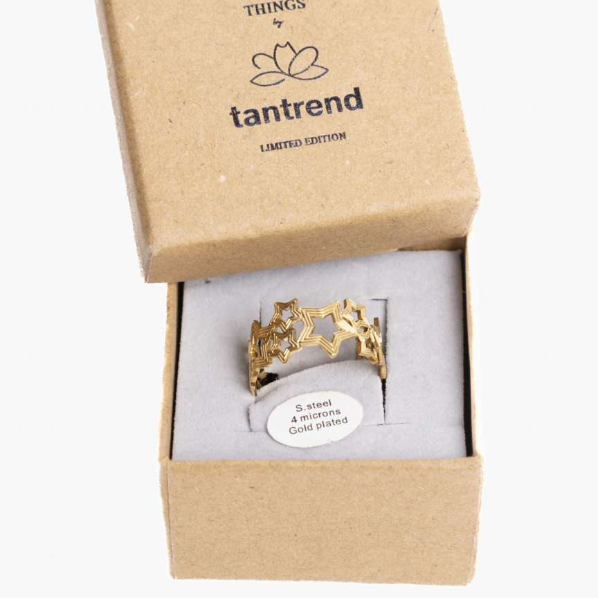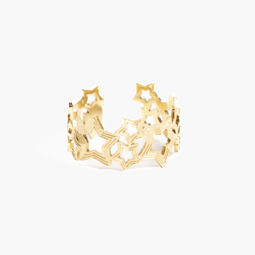 Anel em formato de estrelas recortadas, em diversos tamanhos. Feito em aço inoxidável com banho de ouro 14K. Cor única: dourado. Embalagem única. Medidas: ajustáveis. Composição: aço inoxidável.