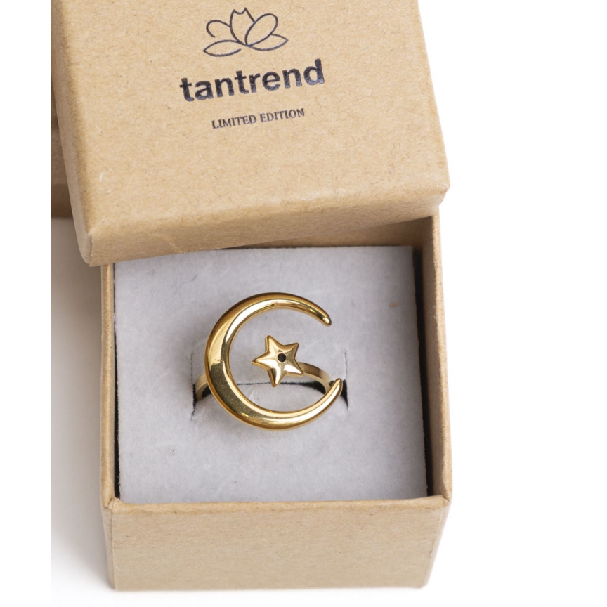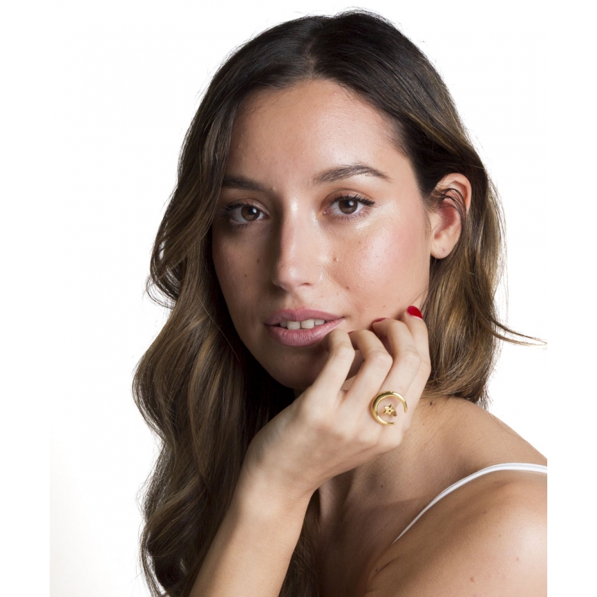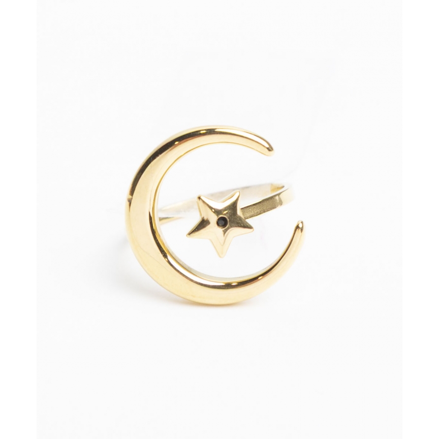 Anel ajustável em formato de lua e estrela. Feito em aço inoxidável banhado a ouro 14 quilates. Disponível em uma cor: dourado. Peça única. Medidas: ajustáveis. Composição: cristal. Aço inoxidável.
