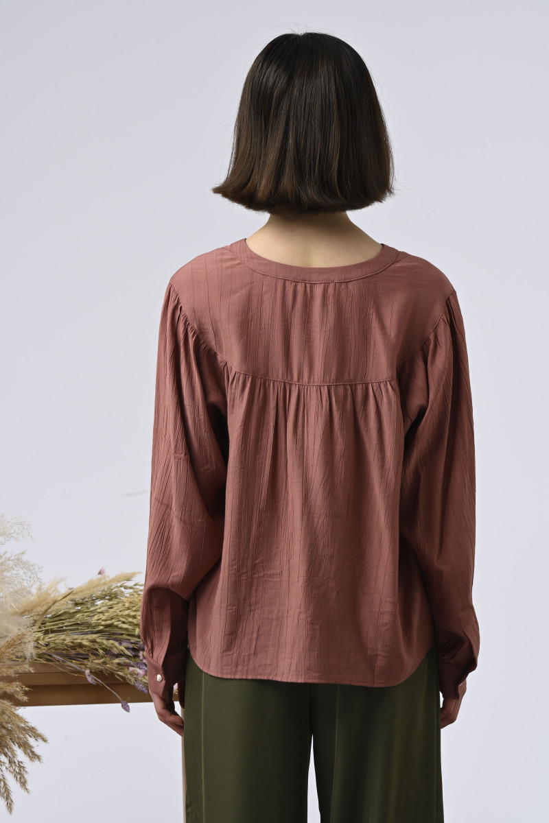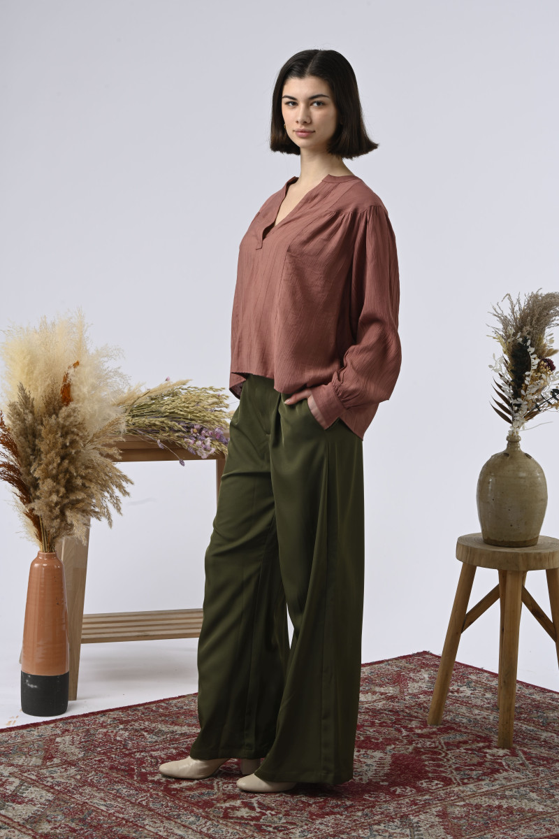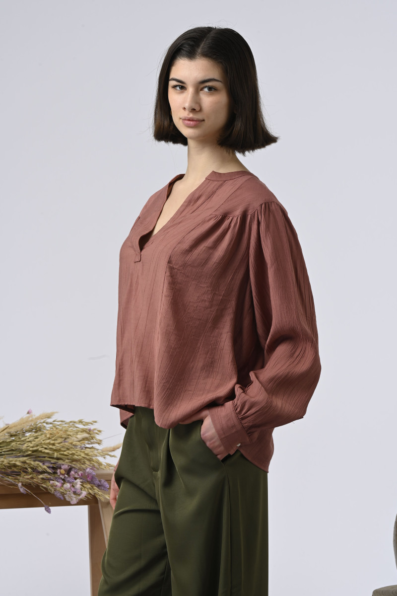 Blusa com gola tunisiana fluida e mangas bufantes.É uma peça tão fluida quanto feminina, combinando o espírito boêmio com um look casual.