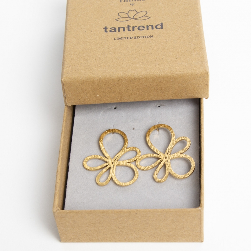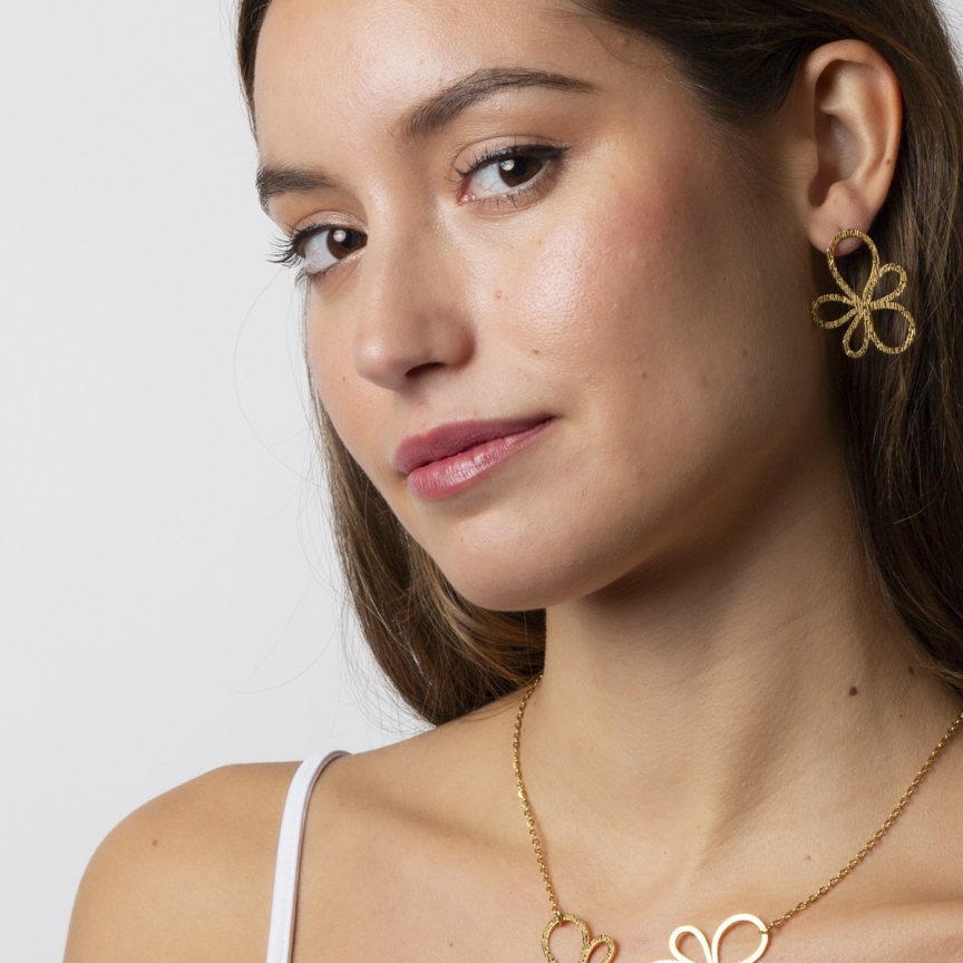 Brincos de flores recortadas com textura, feitos em aço inoxidável com banho de ouro 14K, em uma cor: dourado, embalagem única. Composição: aço inoxidável.