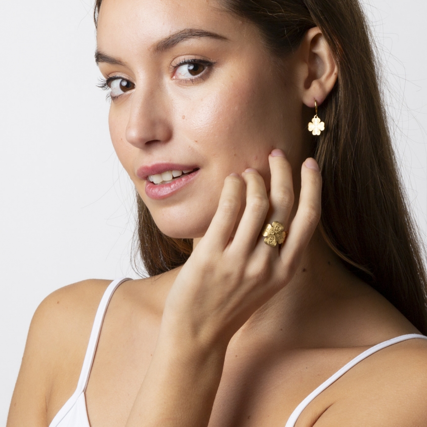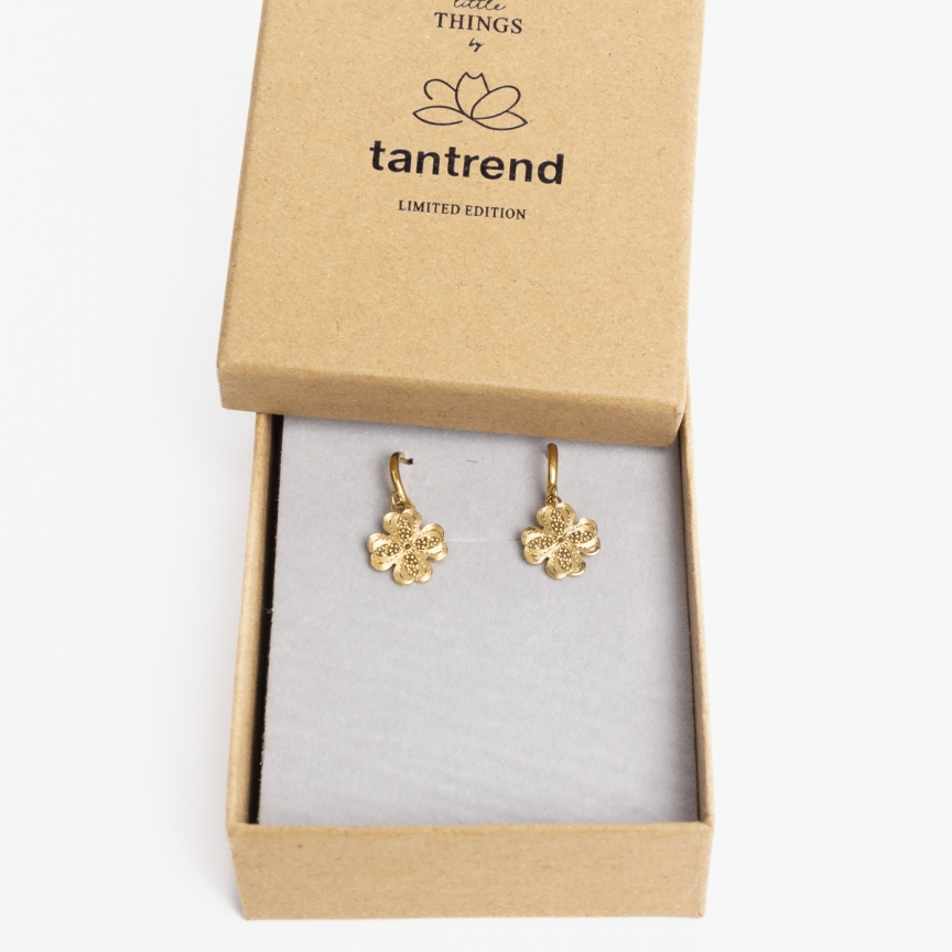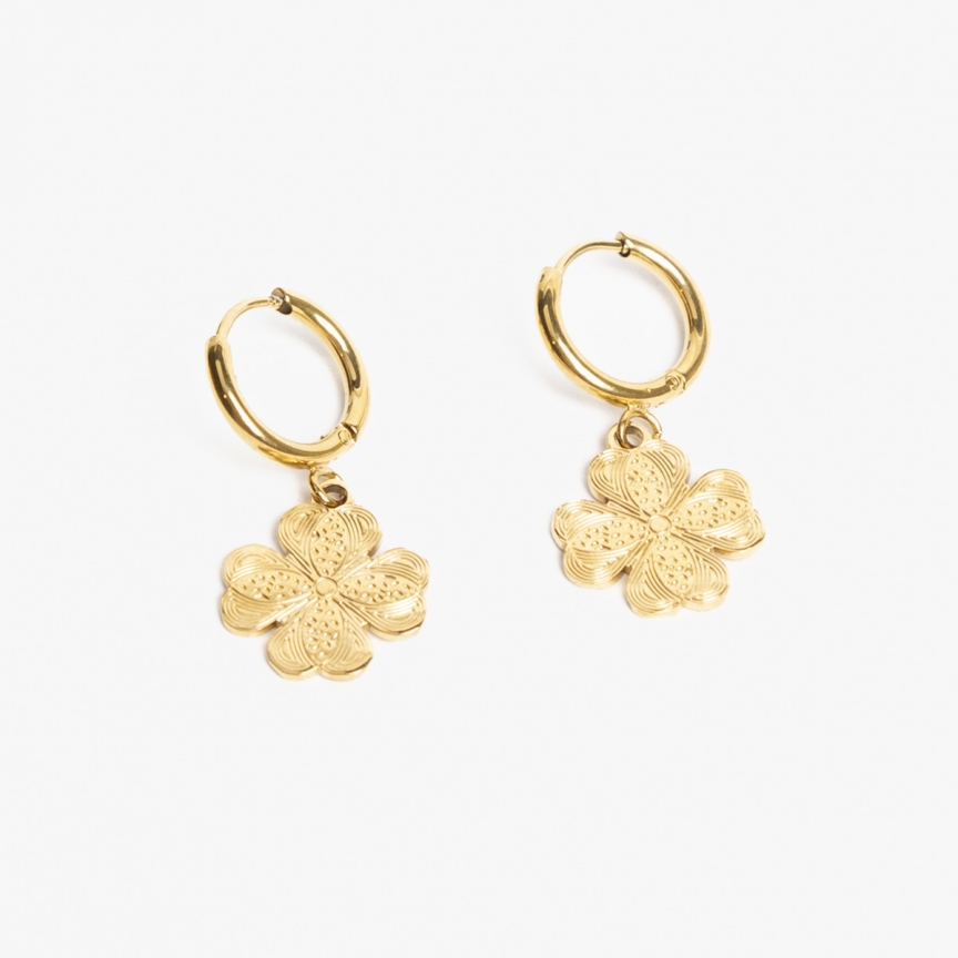 Brincos com pingente texturizado em formato de trevo, feitos em aço inoxidável com banho de ouro 14K, em uma cor: dourado, embalagem única. Composição: aço inoxidável.