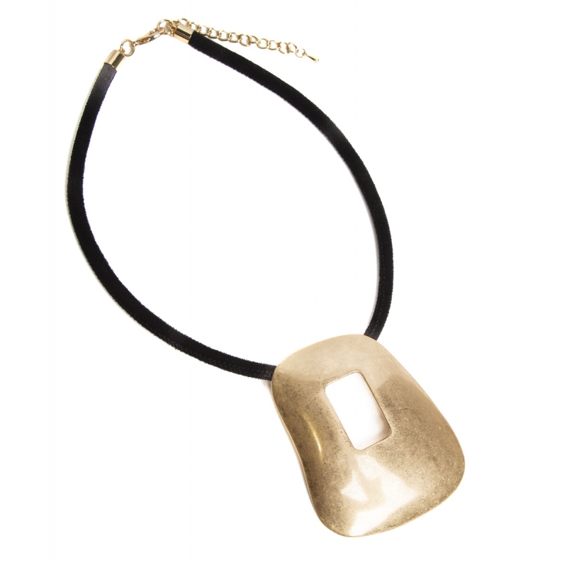 Colar curto de cordão de camurça preta com peça central geométrica irregular em acabamento acetinado.