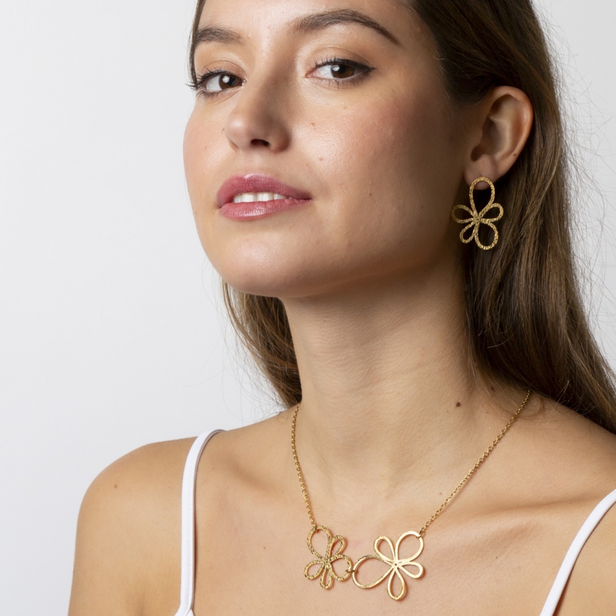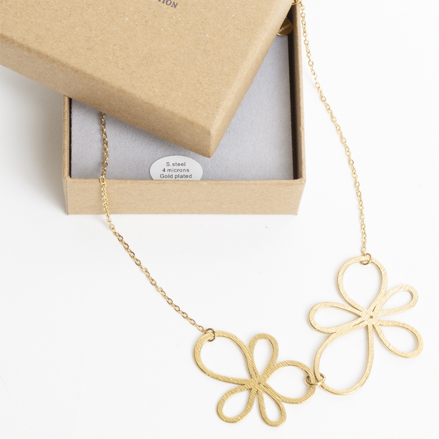 Colar de corrente elegante com pingente articulado com duas flores texturizadas recortadas, feito em aço inoxidável com banho de ouro 14K, em uma cor: dourado, embalagem única. Composição: aço inoxidável.