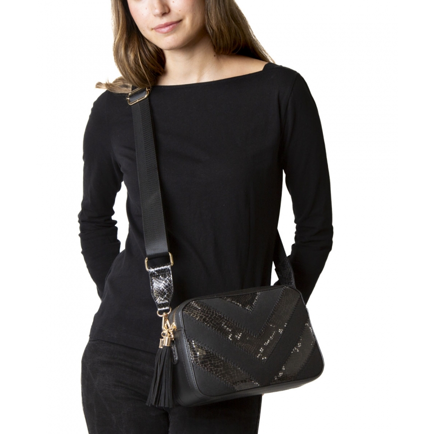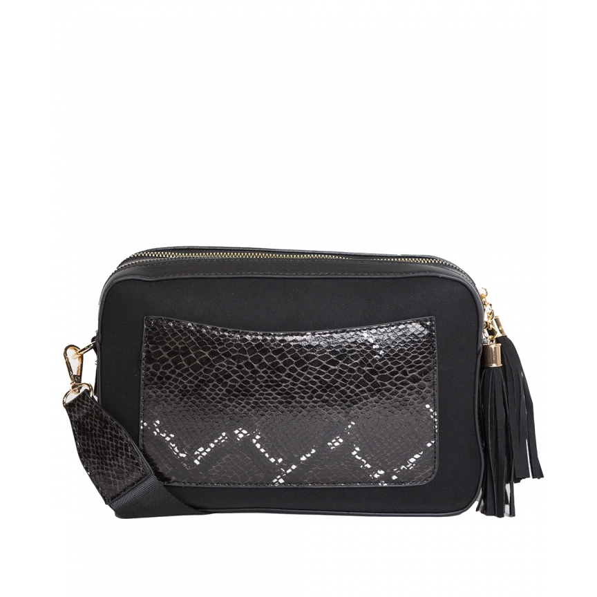 Mala de ombro estilo câmera em camurça com estampas geométricas de cobra em dourado sutil. Zíper duplo com borla e bolso traseiro. Medidas: 26 x 17 x 8 cm.