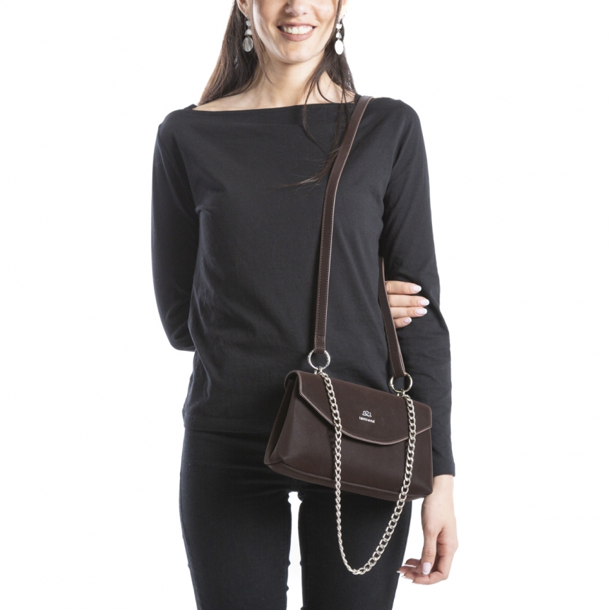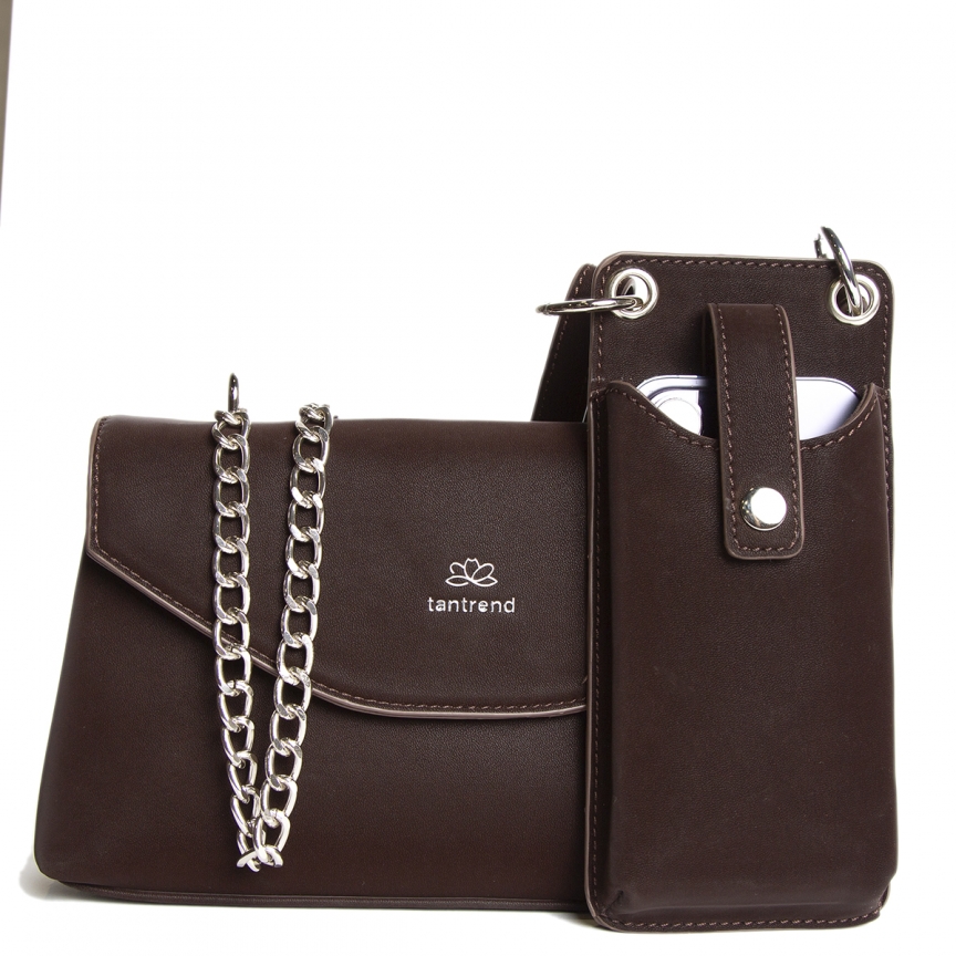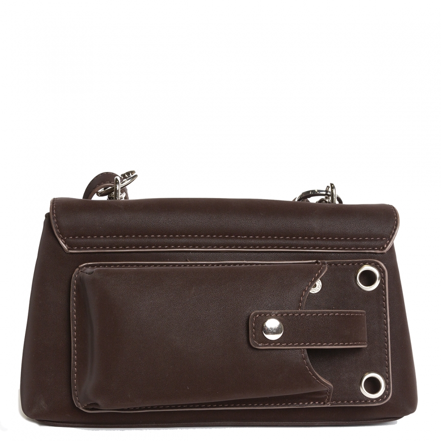 Mala com aba e fecho magnético. Confecionada em material sintético, com alça de corrente metálica e suporte removível para telemóvel na parte traseira. Dimensões: 25 x 14 x 5 cm.